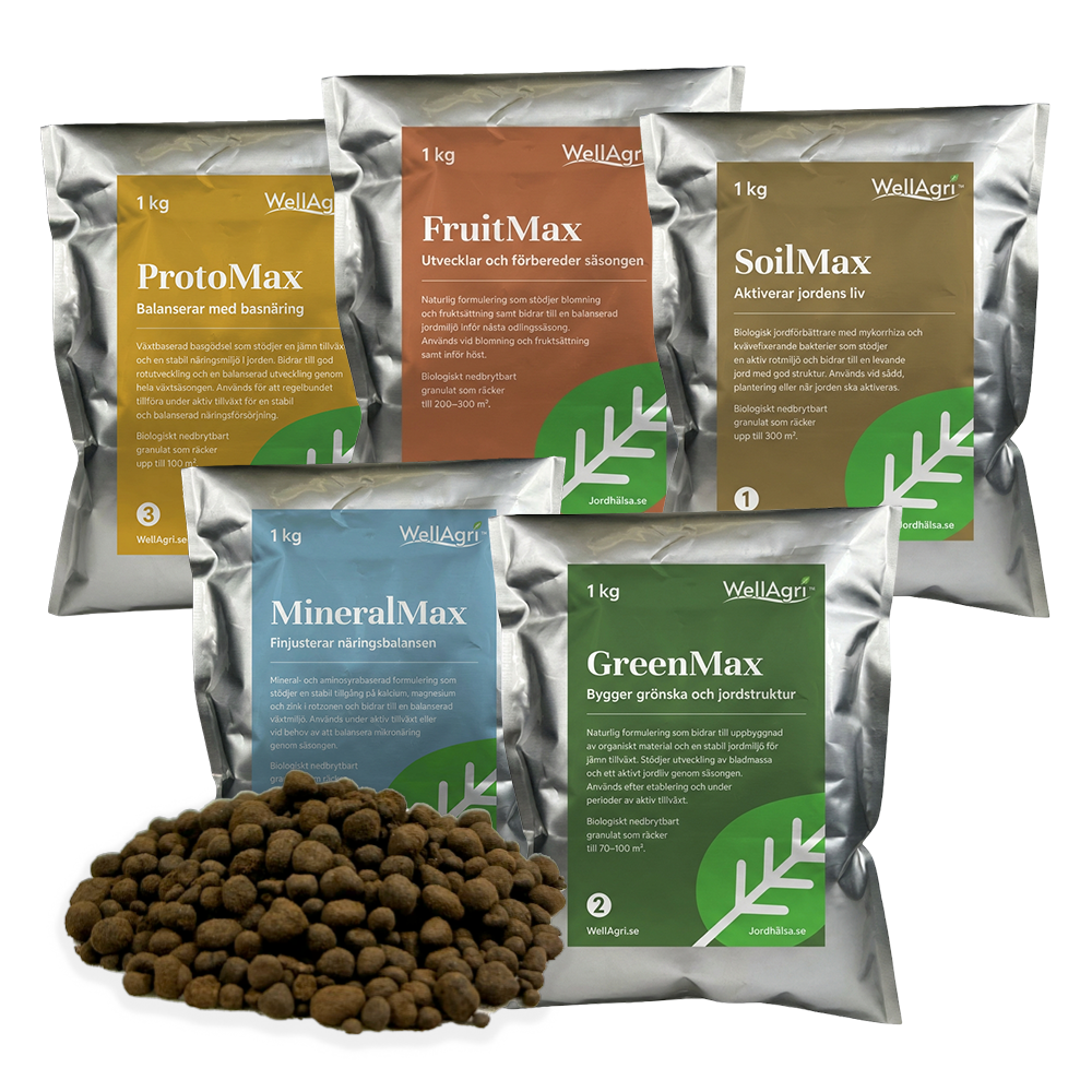 Helårspaketet samlar alla steg i WellAgri System i en komplett lösning för dig som vill arbeta långsiktigt med jordhälsa i trädgården.